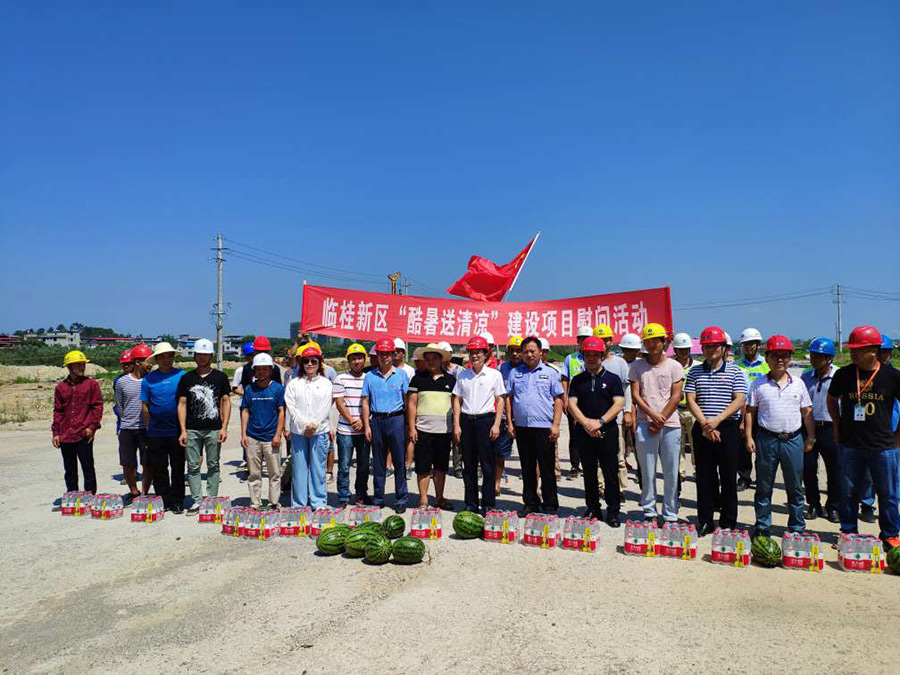 臨桂新區(qū)工委副書記、新區(qū)管委會(huì)副主任、新區(qū)黨總支書記唐標(biāo)明,臨桂新區(qū)工委委員、新區(qū)管委會(huì)副主任、機(jī)關(guān)工會(huì)主席文杰,新城投資集團(tuán)黨支部書記周道林,臨桂新區(qū)工委組織人事部部長(zhǎng)、黨總支紀(jì)檢委員梁利,新城投資集團(tuán)黨支部委員、新城投資集團(tuán)工會(huì)主席譚力源等領(lǐng)導(dǎo)將西瓜、飲用水等防暑降溫用品送到一線建筑工人手中。
