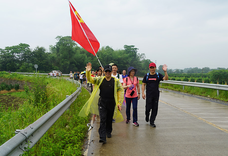 上午11點,同志們乘車到達(dá)全州縣紹水鎮(zhèn)下宅村,整裝齊隊,高舉黨旗,踏上了尋訪當(dāng)年紅軍長征足跡,緬懷革命先烈的紅色之旅。行進(jìn)中,天空下著瓢潑大雨,同志們一邊行軍,一邊唱紅歌,一邊品讀著紅軍長征的艱辛。