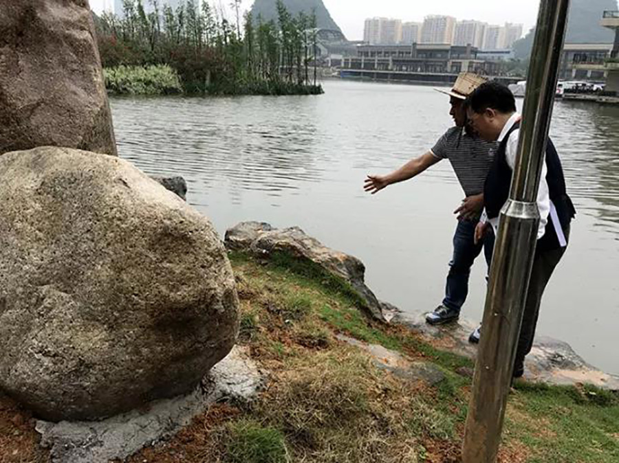 緊接著,檢查組冒雨檢查臨桂新區(qū)橋梁標識石的牢固情況。在現(xiàn)場聽取施工人員的介紹后,檢查組提出進入雨季后,降雨頻繁,要適時加強對橋梁標識石的沉降觀察,以確?;A(chǔ)的安全、穩(wěn)固。