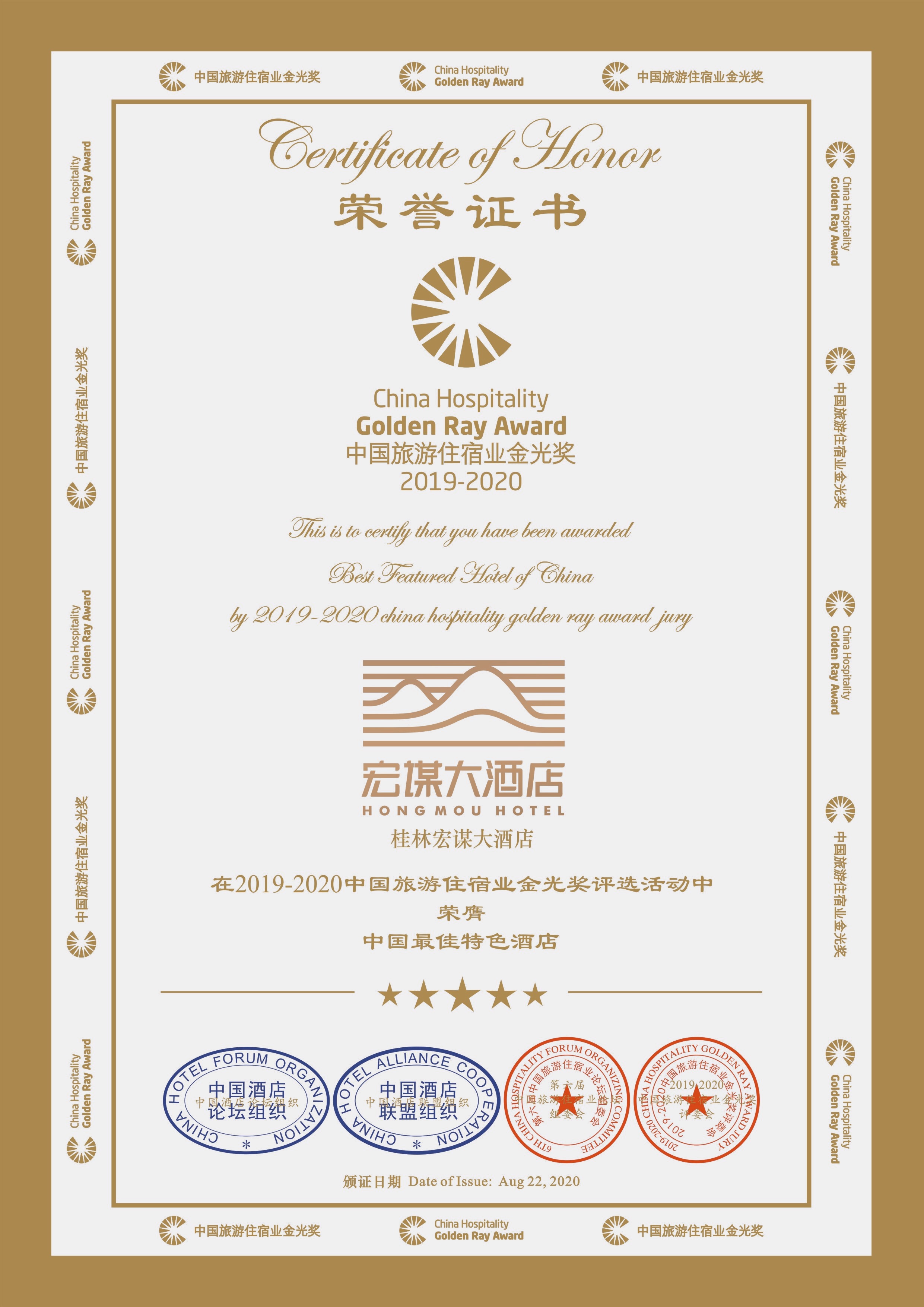 金光獎(jiǎng)是中國旅游住宿行業(yè)跨業(yè)界、跨年度、覆蓋面最廣的獎(jiǎng)項(xiàng),獲獎(jiǎng)評選經(jīng)過各學(xué)術(shù)、專業(yè)、跨界領(lǐng)域評委根據(jù)各酒店競爭力、住房率、收益利潤等多個(gè)標(biāo)準(zhǔn)評選而出。桂林宏謀大酒店此次榮獲中國酒店金光獎(jiǎng)的兩項(xiàng)殊榮,是對酒店不斷深化文化藝術(shù)主題,追求酒店優(yōu)秀服務(wù)品質(zhì)的認(rèn)可!