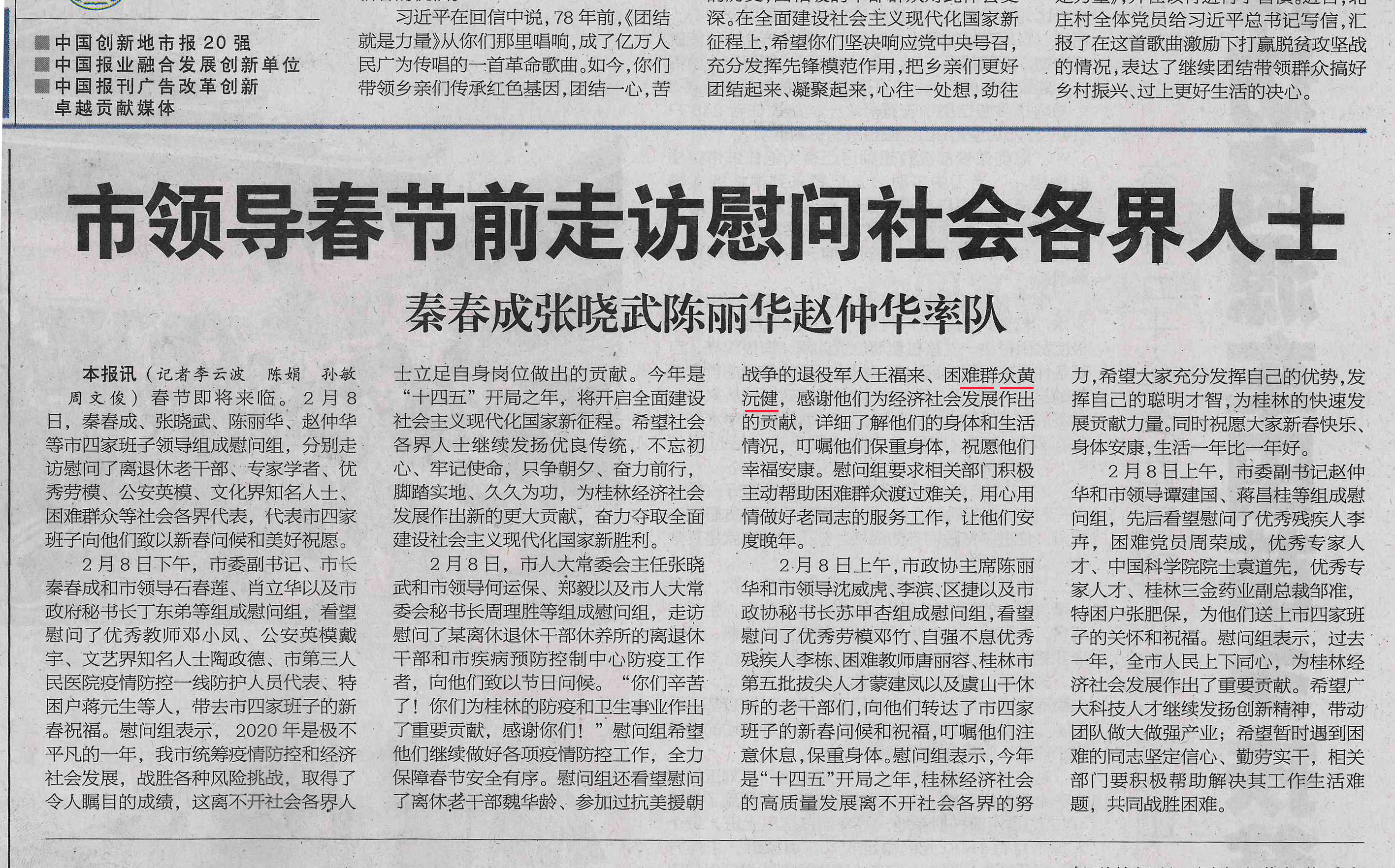 2月8日,市人大常委會主任張曉武和市領(lǐng)導(dǎo)何運保、鄭毅以及市人大常委會秘書長周理勝等組成慰問組,走訪慰問了桂林新城投資集團(tuán)困難職工黃沅健。