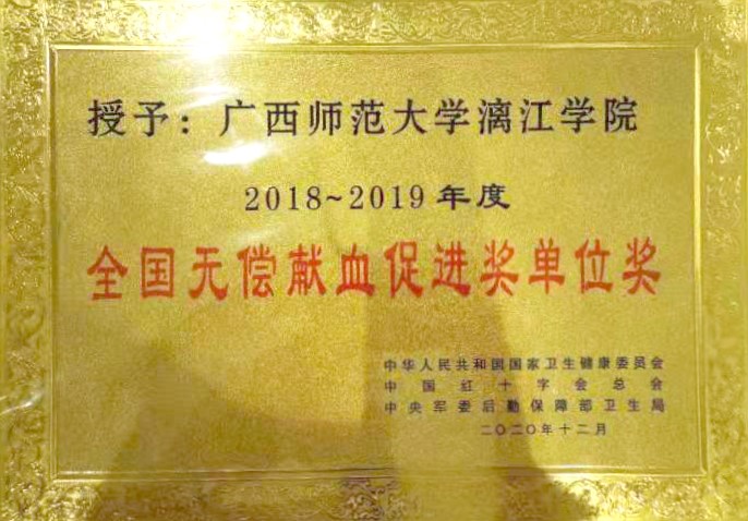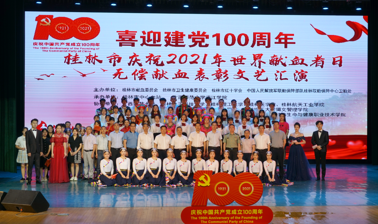 6月9日,由桂林市獻(xiàn)血委員會(huì)、桂林市衛(wèi)生健康委員會(huì)、桂林市紅十字會(huì)、中國(guó)人民解放軍聯(lián)勤保障部隊(duì)桂林聯(lián)勤保障中心衛(wèi)勤處主辦,桂林市中心血站、廣西師范大學(xué)漓江學(xué)院承辦的“喜迎建黨100周年桂林市慶祝2021年世界獻(xiàn)血者日無(wú)償獻(xiàn)血表彰文藝匯演”活動(dòng)在漓江學(xué)院召開(kāi)。漓江學(xué)院獲得全場(chǎng)唯一“全國(guó)無(wú)償獻(xiàn)血促進(jìn)獎(jiǎng)單位獎(jiǎng)”。