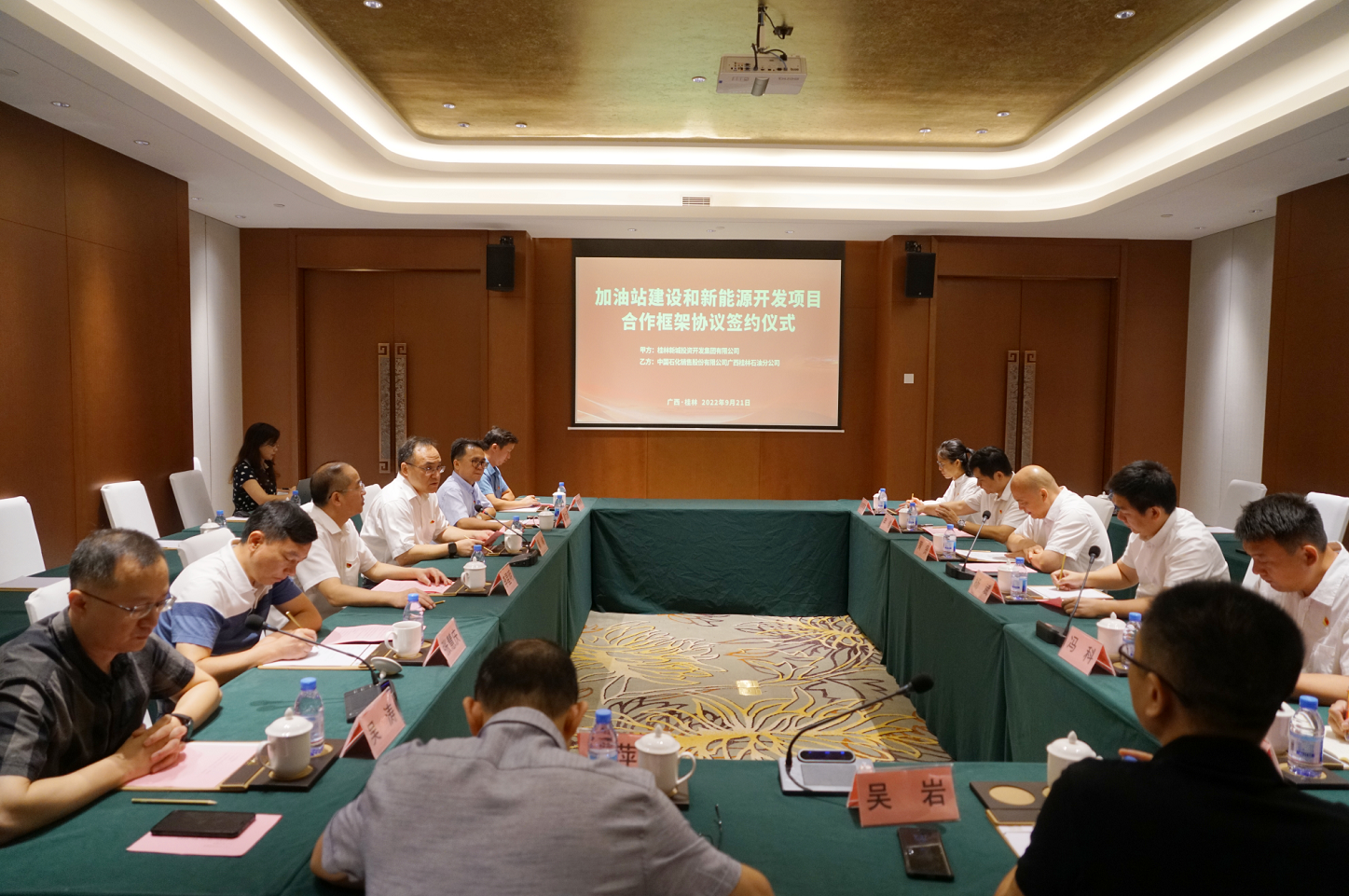 2022年9月21日,桂林新城投資開發(fā)集團有限公司(以下簡稱新城投集團)與中國石化銷售股份有限公司廣西桂林石油分公司(以下簡稱中石化桂林分公司)在桂林宏謀大酒店舉行桂林新區(qū)加油站建設(shè)和新能源開發(fā)項目合作框架協(xié)議簽約儀式。臨桂新區(qū)黨工委委員、管委會常務(wù)副主任李星明,黨工委委員、管委會副主任張慧慶,新城投集團黨總支副書記、總經(jīng)理黃峻,中石化桂林分公司總經(jīng)理黃賢出席簽約儀式。簽約儀式由新城投集團副總經(jīng)理吳濤主持。