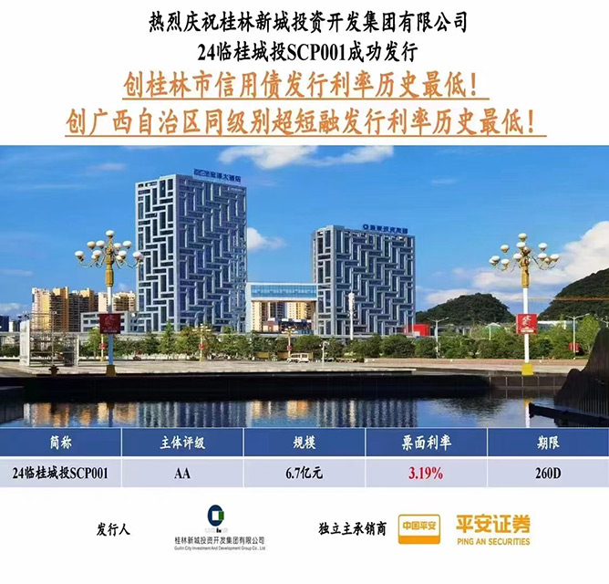 1月9日,桂林城鄉(xiāng)建設(shè)控股集團旗下桂林新城投資開發(fā)集團有限公司成功發(fā)行2024年度第一期超短融,規(guī)模6.7億元,期限260天,票面利率3.19%,認(rèn)購倍數(shù)5.08倍,本期超短融由平安證券獨立承銷。此次成功發(fā)行超短融創(chuàng)下桂林市有史以來信用債發(fā)行的最低利率,也是有史以來廣西壯族自治區(qū)同級別超短融發(fā)行利率最低!在市委市政府、市金融辦、市國資委、城建集團的指導(dǎo)幫助下,新城投集團認(rèn)真落實各項決策部署,結(jié)合自身實際,爭分奪秒抓發(fā)展,多措并舉促融資。