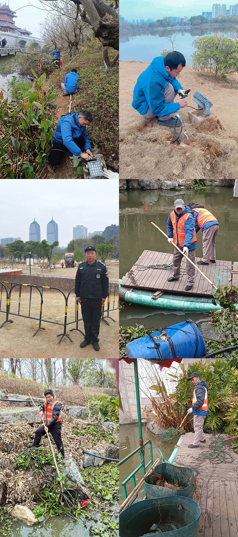 黨員同志帶頭成立工作小組,對山水公園的環(huán)境衛(wèi)生、園林綠化、水系水域、電力系統(tǒng)、照明設施等關鍵領域進行全面、細致的檢查與維護工作,同時,加強山水公園安保力量,加大煙花燃放點的巡查力度,安排專人對煙花組裝區(qū)域?qū)嵤﹪烂苁刈o,并全力配合三大通信運營商及其他相關部門做好用電取電工作,有效保障了活動的順利進行,確保活動當日向市民呈現(xiàn)一個安全、舒適的活動環(huán)境。