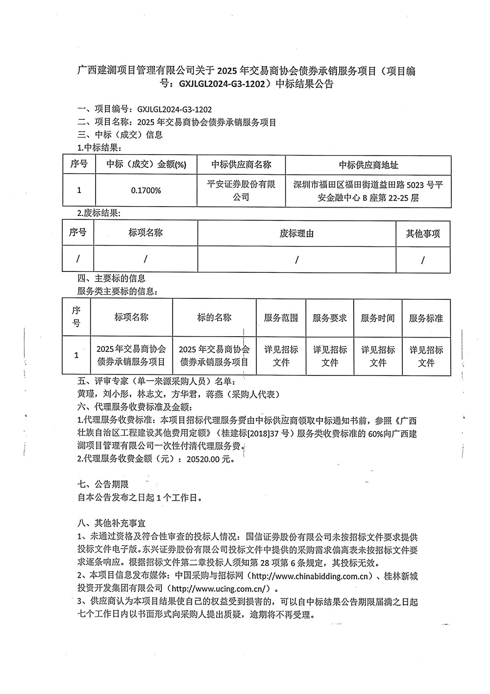 廣西建瀾項目管理有限公司關(guān)于2025年交易商協(xié)會債券承銷服務項目(項目編號:GXJLGL2024-G3-1202)中標結(jié)果公告