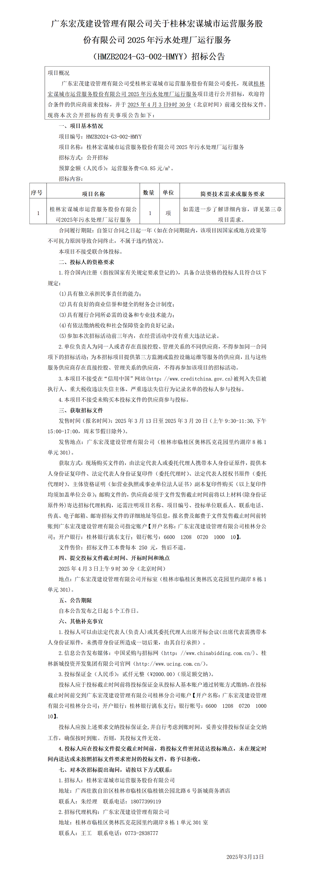 廣東宏茂建設(shè)管理有限公司關(guān)于桂林宏謀城市運(yùn)營服務(wù)股份有限公司2025年污水處理廠運(yùn)行服務(wù)(HMZB2024-G3-002-HMYY)招標(biāo)公告