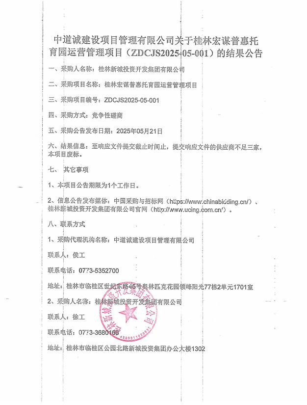 中道誠建設項目管理有限公司關(guān)于桂林宏謀普惠托育園運營管理項目(ZDCJS2025-05-001)的結(jié)果公告