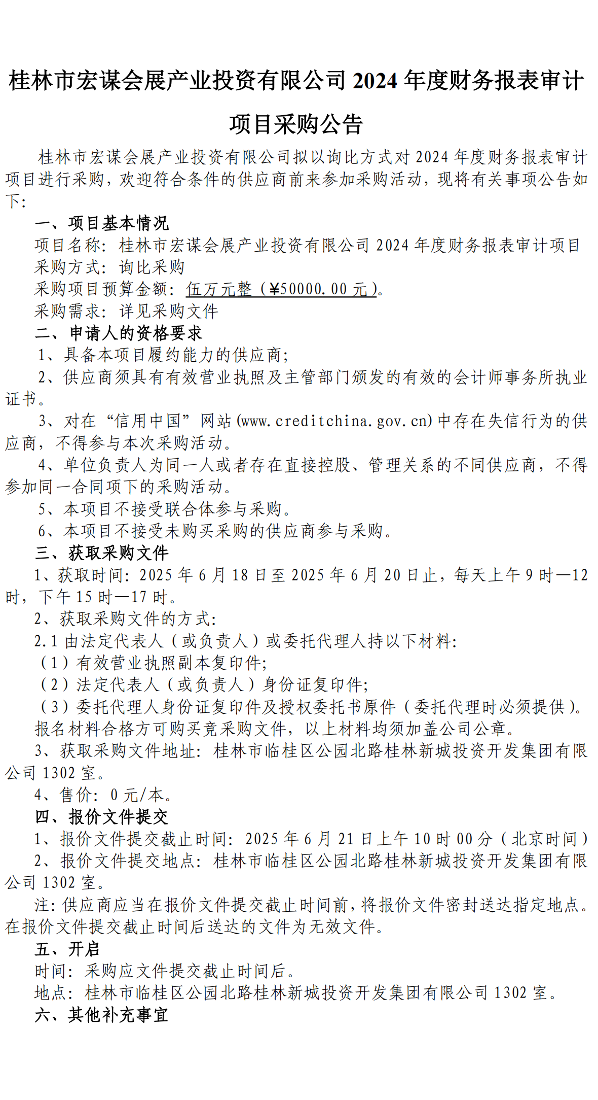 桂林市宏謀會展產業(yè)投資有限公司2024年度財務報表審計項目采購公告